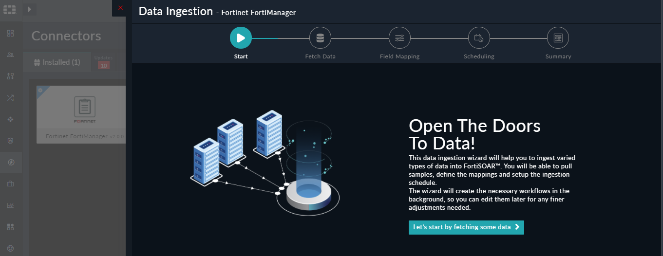 Use the Data Ingestion Wizard to easily ingest data into FortiSOAR™ by pulling incidents from Fortinet FortiManager. Currently, "incidents" in Fortinet FortiManager are mapped to "alerts" in FortiSOAR™. For more information on the Data Ingestion Wizard, see the "Connectors Guide" in the FortiSOAR™ product documentation.