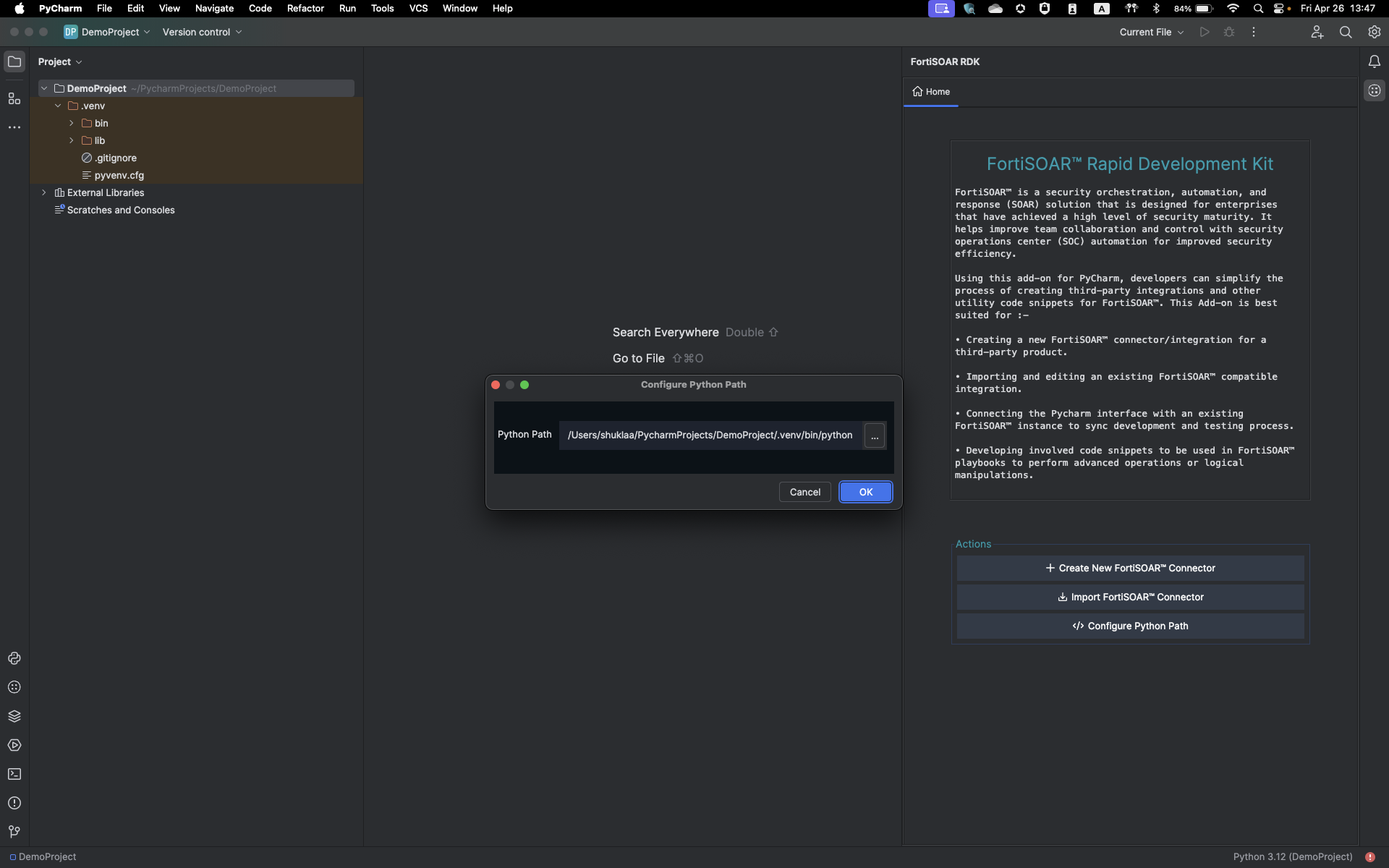 zip file, to restart the PyCharm IDE and upgrade FortiSOAR RDK.Before you begin working on creating connectors or updating existing connectors, ensure that the Python path of your project is correctly configured.