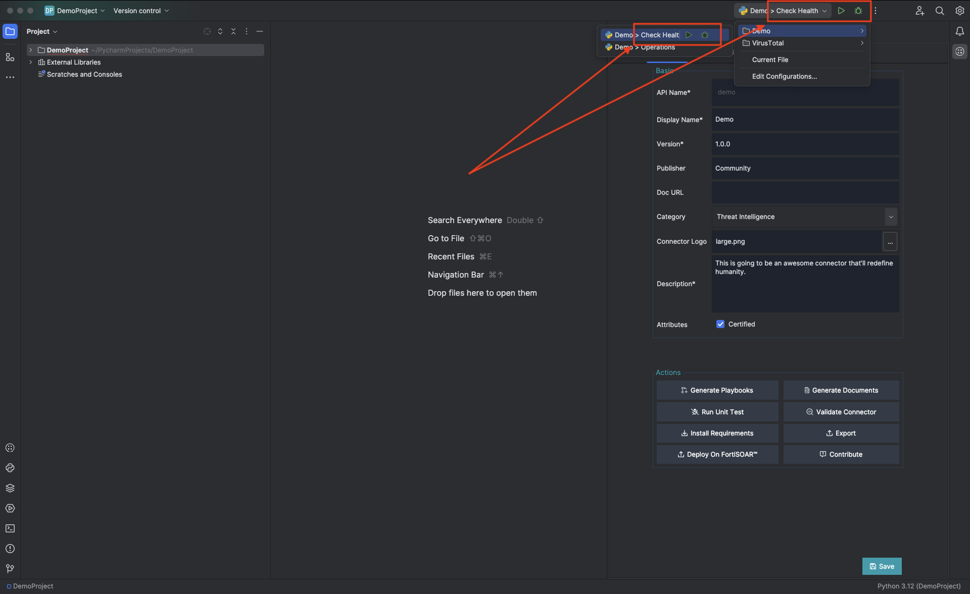 Once you have created or imported a connector, perform the following steps to set up Run and Debug in Pycharm's Python.