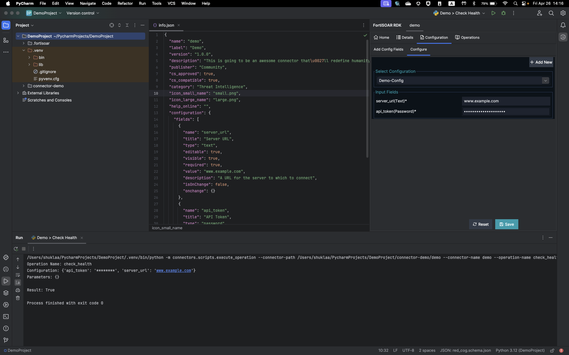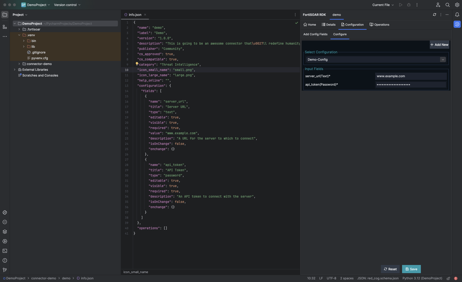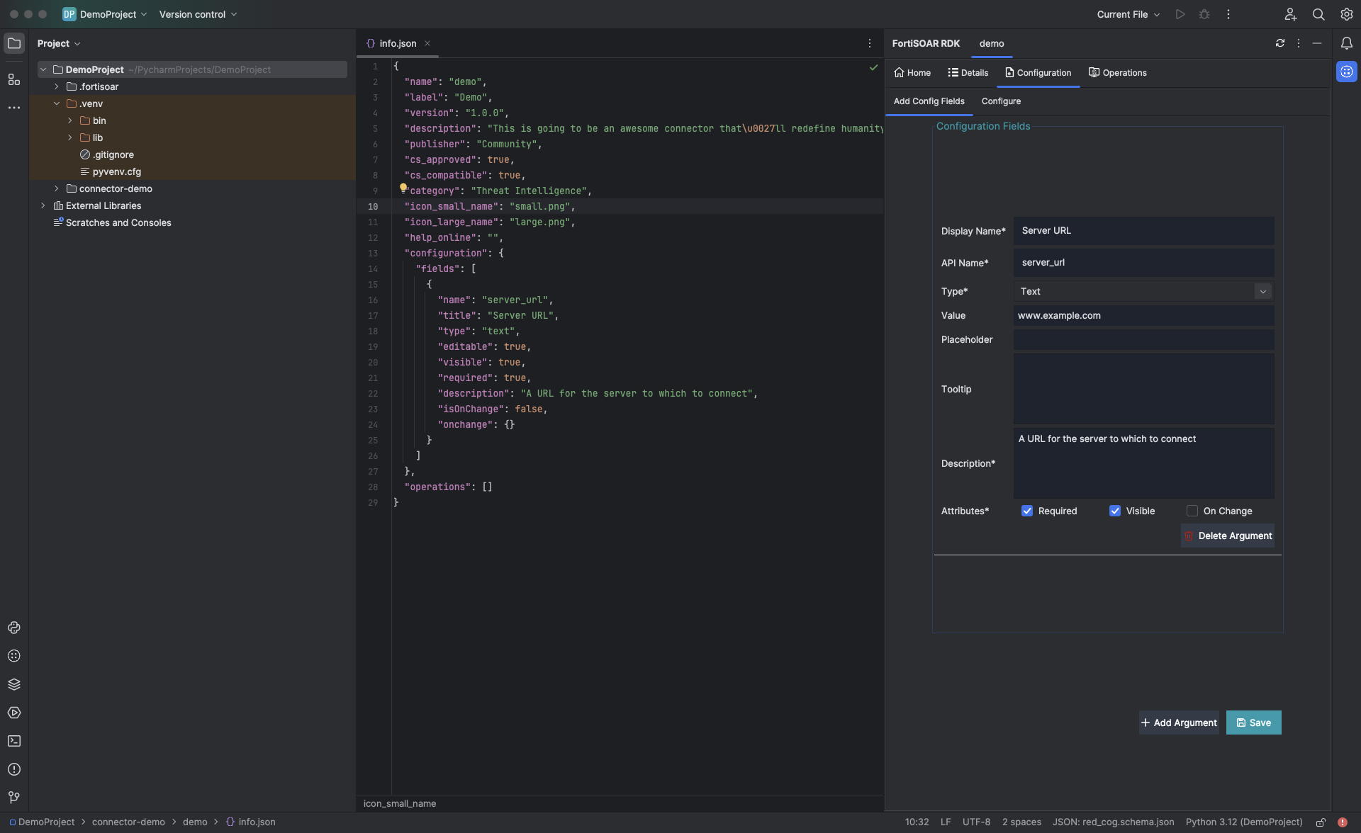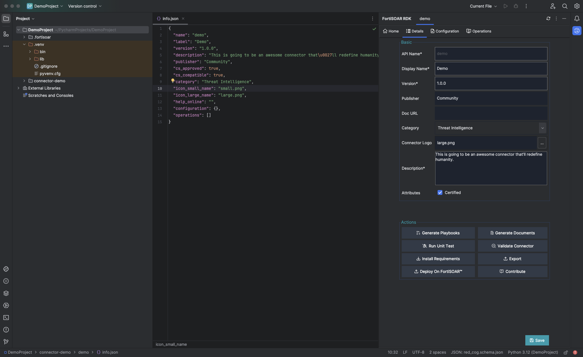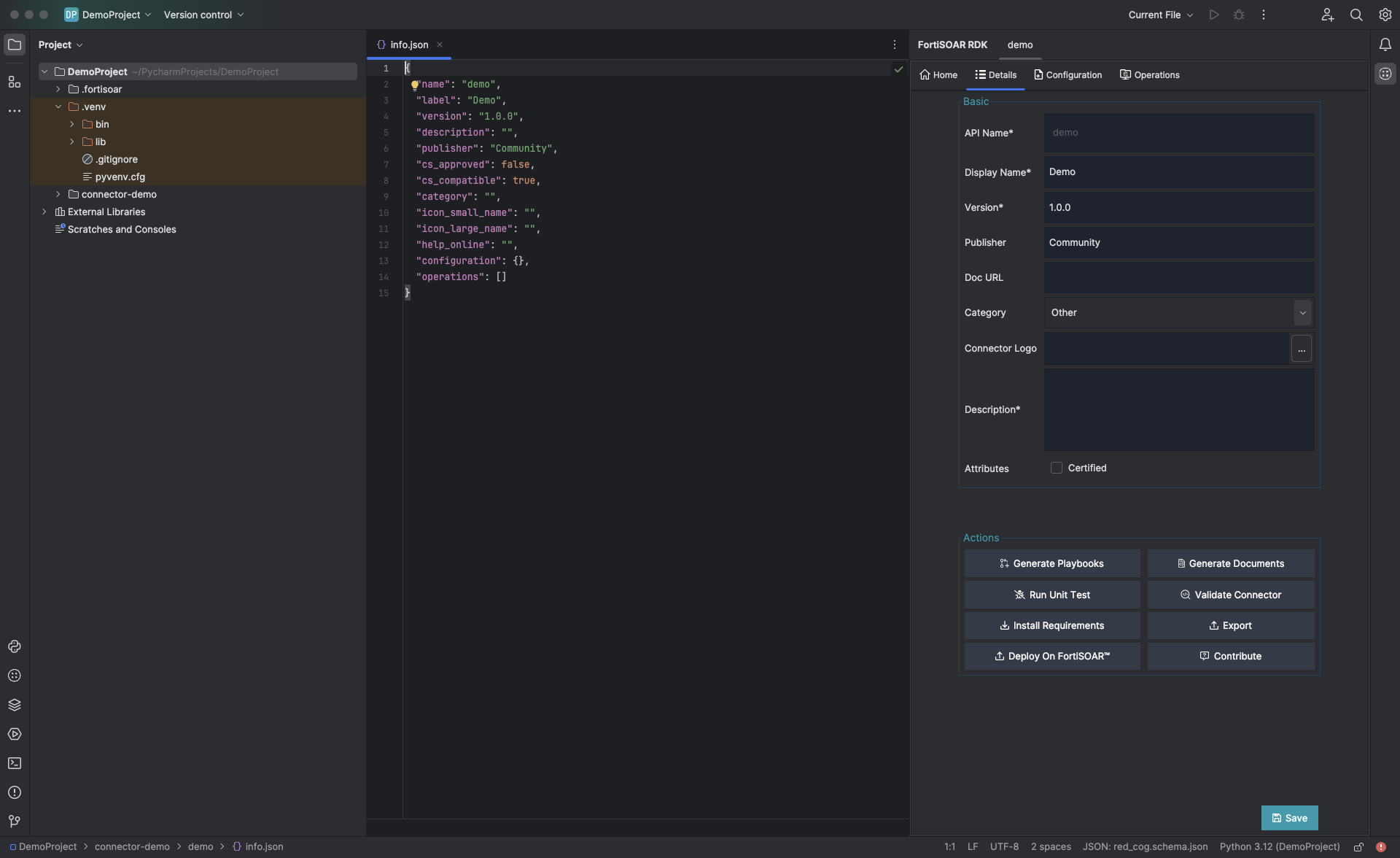 Once you complete entering the required values in the New FortiSOAR Connector dialog, click OK. Clicking OK displays, a success message and opens the info.json file of the connector. This also opens the Details tab in FortiSOAR RDK with the API Name you have specified, demo in our example: