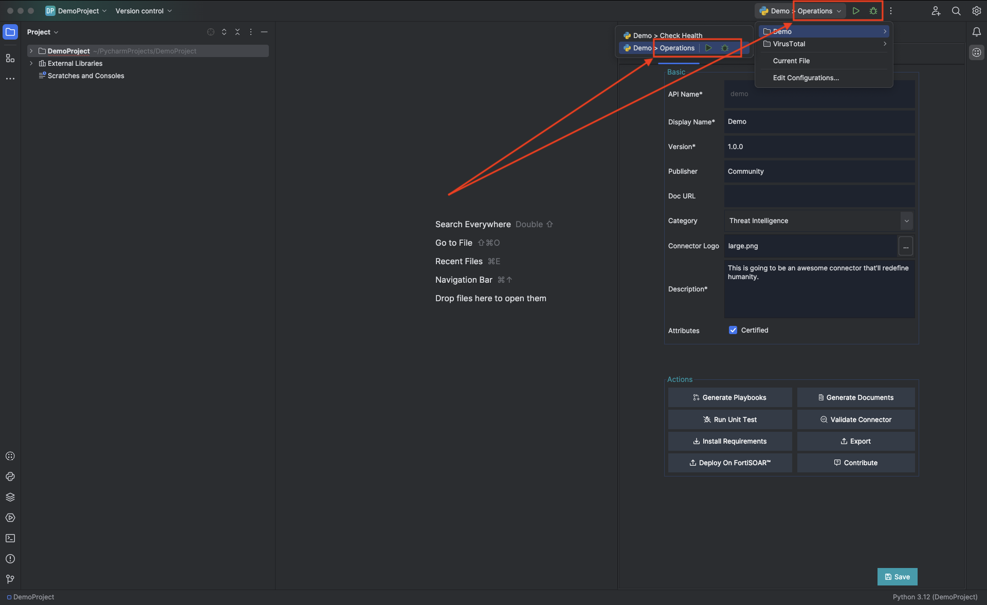We've used PyCharm's Python Run and Debug configuration for a connectors' operation and configuration. The Run and Debug configurations are available as buttons on the PyCharm dock.