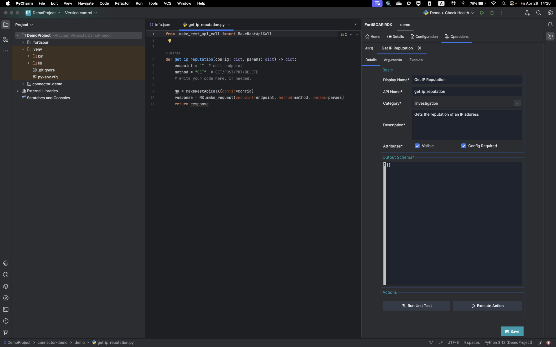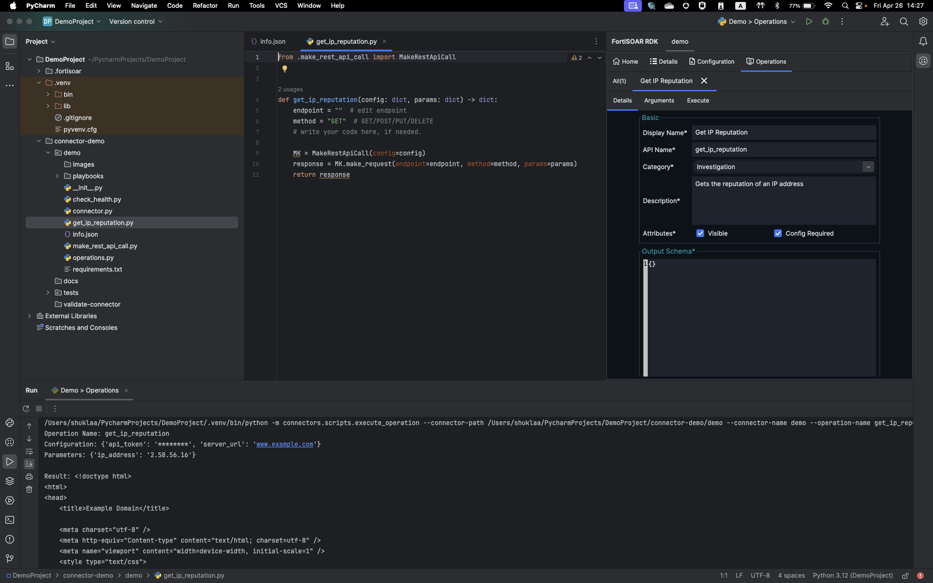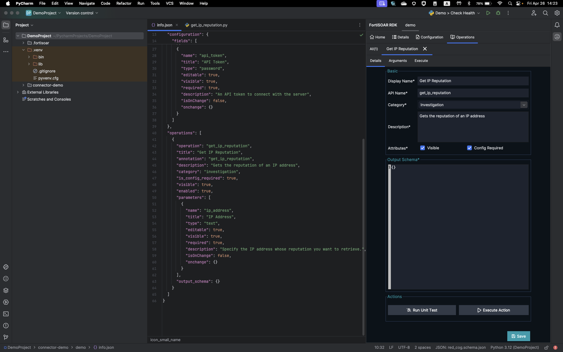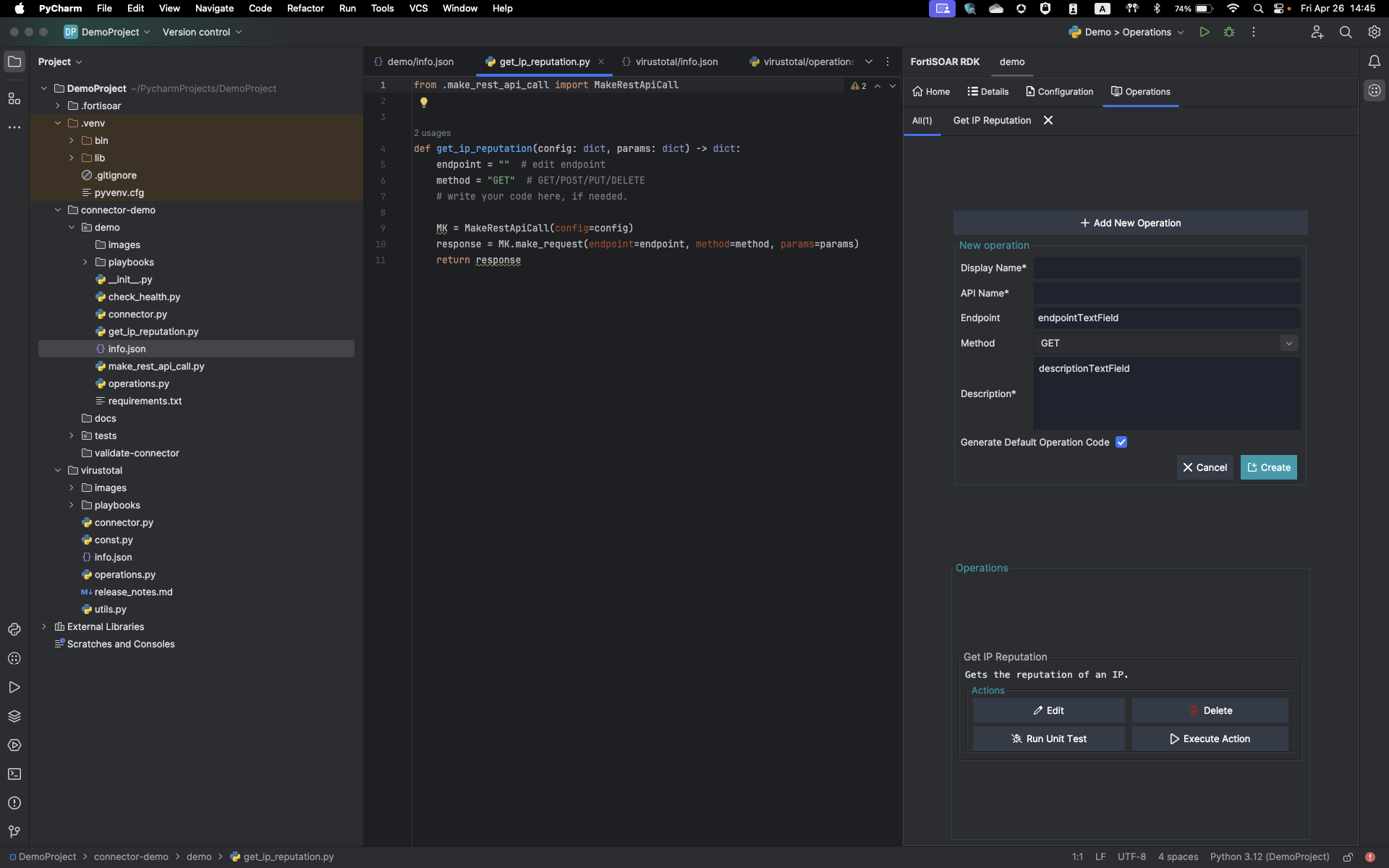 Once you have entered all the required parameters for the operation, click Create. This creates a new .py file with the operation name, for example, get_ip_reputation.py, and also adds the operation details in the "operations":{ section of the info.json file: