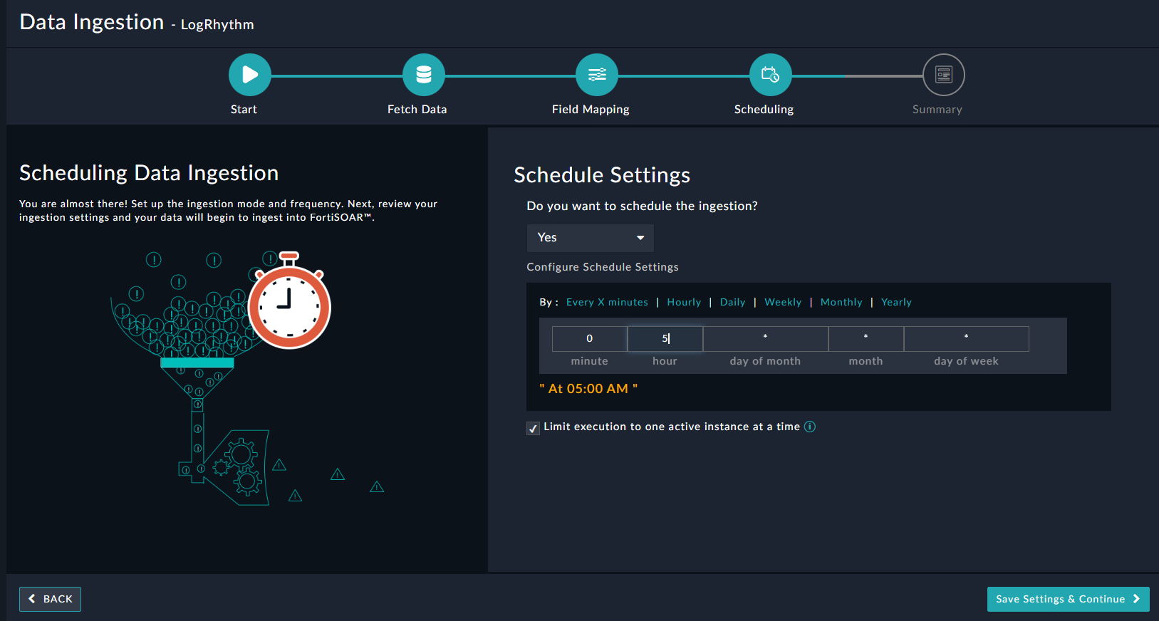 Use the Scheduling screen to configure schedule-based ingestion, i.e., specify the polling frequency to LogRhythm, so that the content gets pulled from the LogRhythm integration into FortiSOAR™.