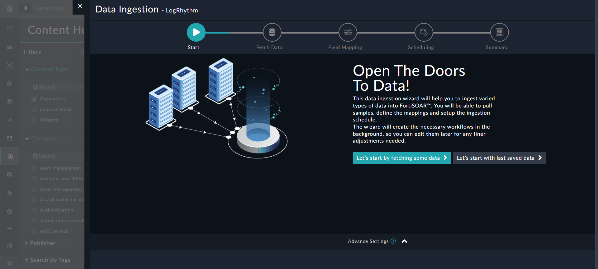 Use the Data Ingestion Wizard to easily ingest data into FortiSOAR™ by pulling alarms from LogRhythm. Currently, alarms ingested from LogRhythm are mapped to "alerts" in FortiSOAR™. For more information on the Data Ingestion Wizard, see the "Connectors Guide" in the FortiSOAR™ product documentation.