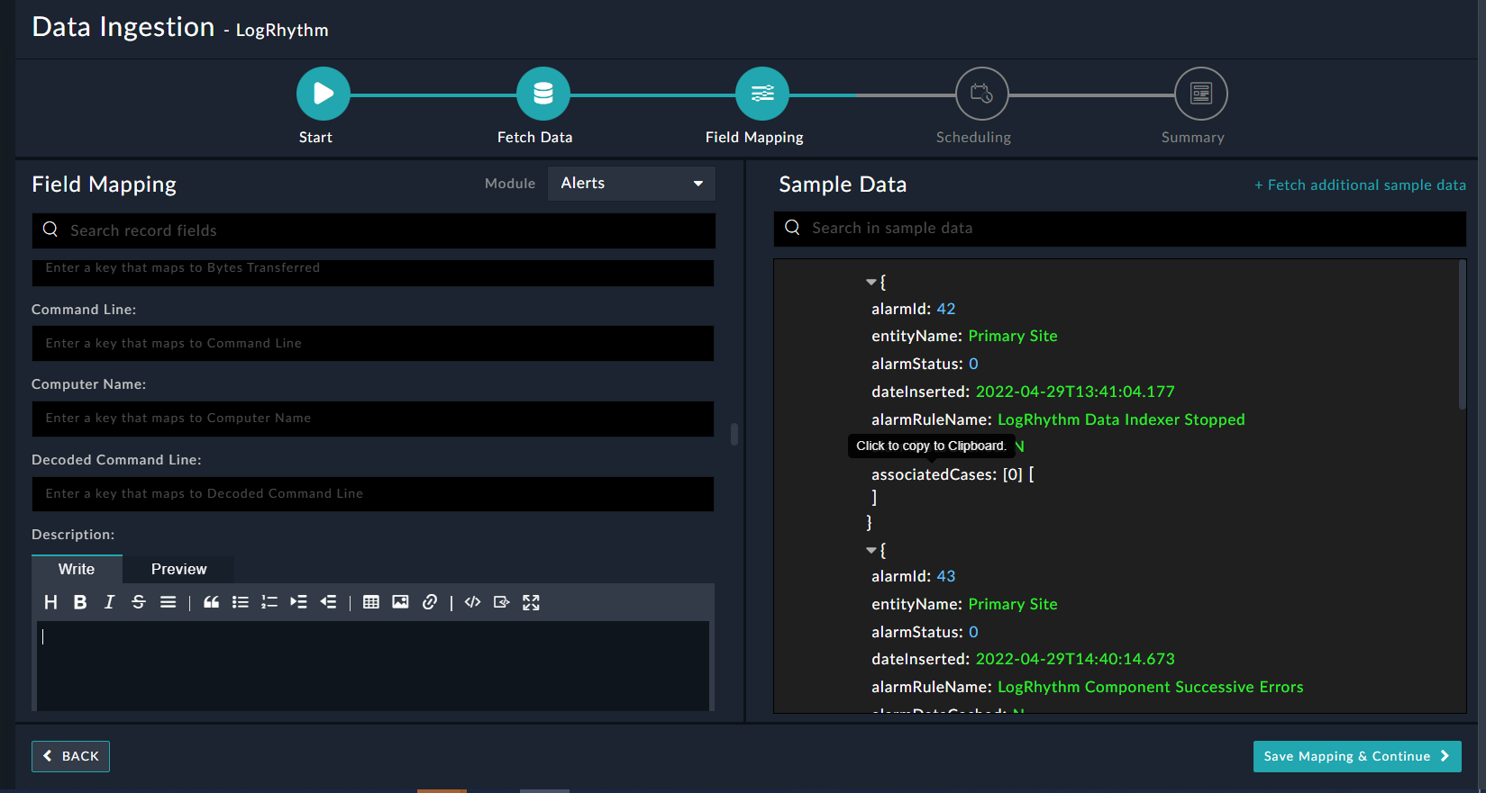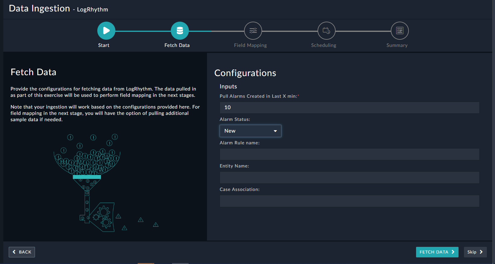 The Data Ingestion Wizard enables you to configure the scheduled pulling of data from LogRhythm into FortiSOAR™. It also lets you pull some sample data from LogRhythm using which you can define the mapping of data between LogRhythm and FortiSOAR™. The mapping of common fields is generally already done by the Data Ingestion Wizard; users are mostly required to only map any custom fields that are added to alarms from LogRhythm.
