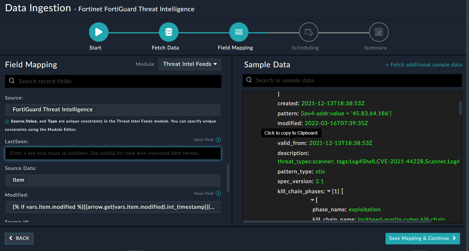 You can configure data ingestion using the “Data Ingestion Wizard” to seamlessly map the incoming FortiGuard Threat Intelligence data to FortiSOAR™ "threat intel feeds". The Data Ingestion Wizard enables you to configure the scheduled pulling of data from the FortiGuard Threat Intelligence into FortiSOAR™. It also lets you pull some sample data from FortiGuard Threat Intelligence using which you can define the mapping of data between the FortiGuard Threat Intelligence and FortiSOAR™. The mapping of common fields is generally already done by the Data Ingestion Wizard; users are mostly required to only map any custom fields that are added to the FortiGuard Threat Intelligence.