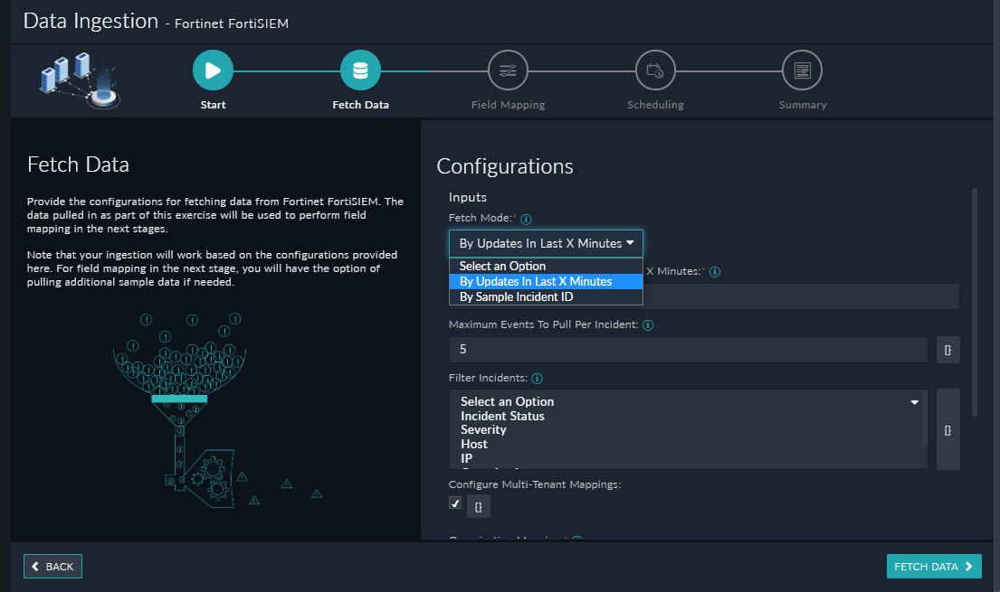 You can configure data ingestion using the “Data Ingestion Wizard” to seamlessly map the incoming FortiSIEM "Incidents" to FortiSOAR™ "Alerts".