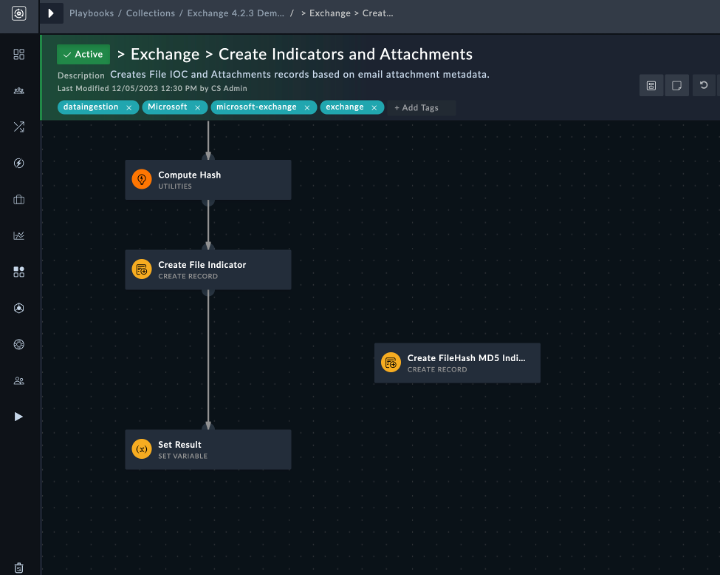 If you are updating the Exchange connector to v4.2.3, and SFSP v2.2.1 is not deployed on your system, it is recommended to de-link Create FileHash MD5 Indicator step from the > Exchange > Create Indicators and Attachments playbook.