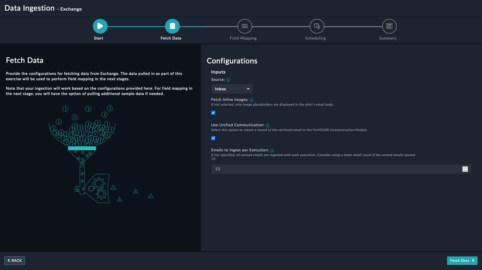 You can configure data ingestion using the “Data Ingestion Wizard” to seamlessly map the incoming Exchange email content to FortiSOAR™ "Alerts".