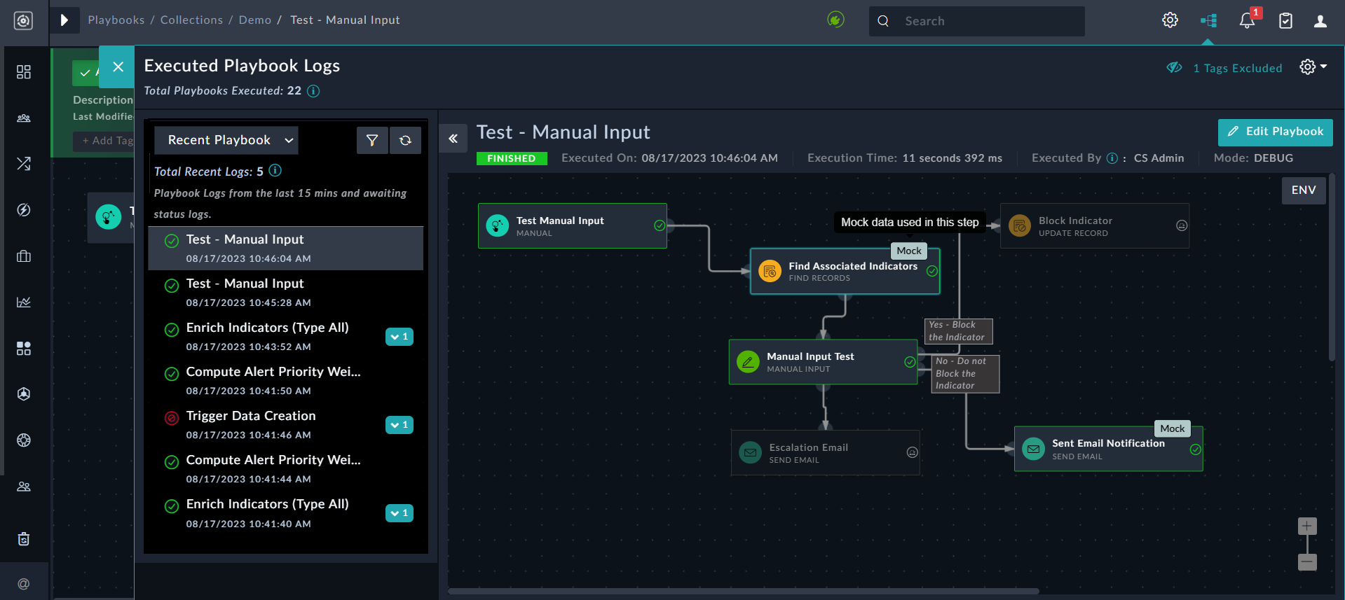 In release 7.4.2, the user experience of using mock output is streamlined, where the mock outputs can optionally be ingested from the most recent successful playbook execution, saving users the time of having to manually provide mock outputs on a step-by-step basis.This ensures users can test playbooks in development environments without needing to re-execute previously successful steps to obtain live results.