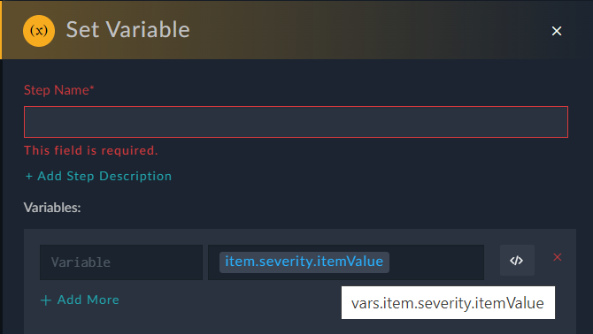 In this example, we are using theitemValueof a item (i.e.severitypicklist) that is part of a loop in that step.