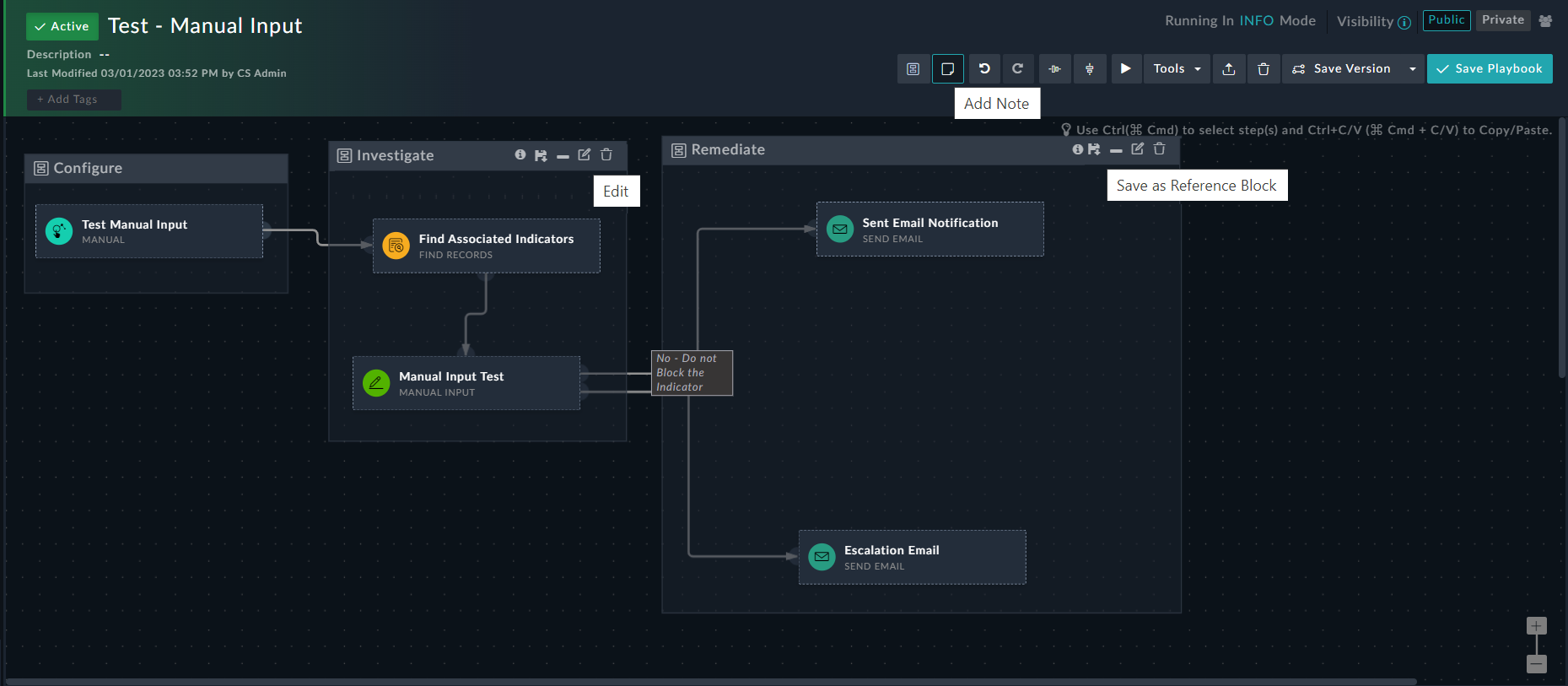 - Copy the updated steps or blocks from the 'Base' version to your edited playbook and save that playbook. For information on how to add blocks to playbooks, see the Adding blocks and notes in the playbook designer topic.