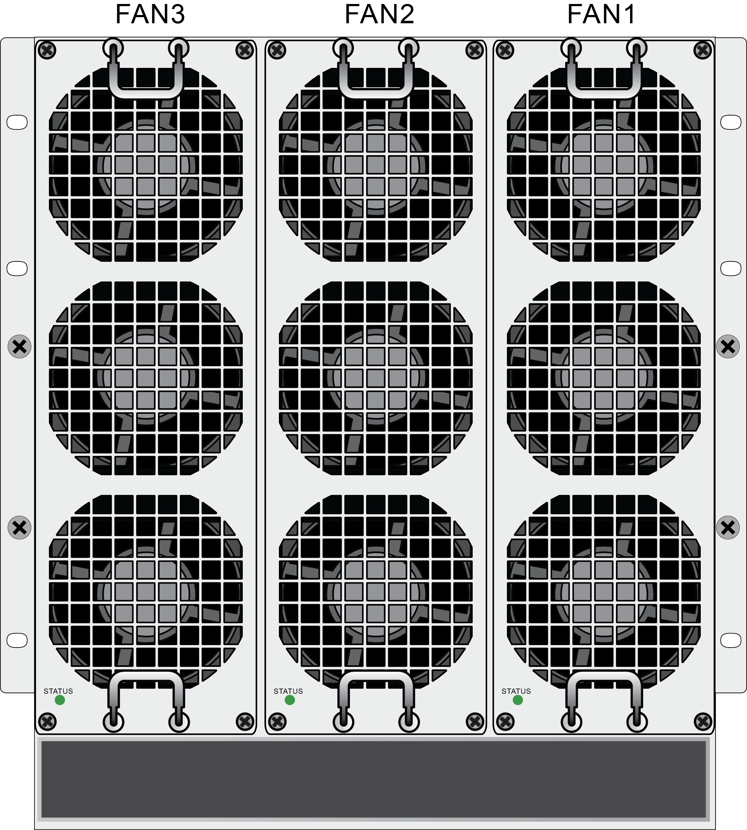 The FortiSwitch-AX9004G series back panel supports the installation of three hot-swappable cooling fan units. For more information about fan units, including how to replace them, see Cooling fans, cooling air flow, and minimum clearance.