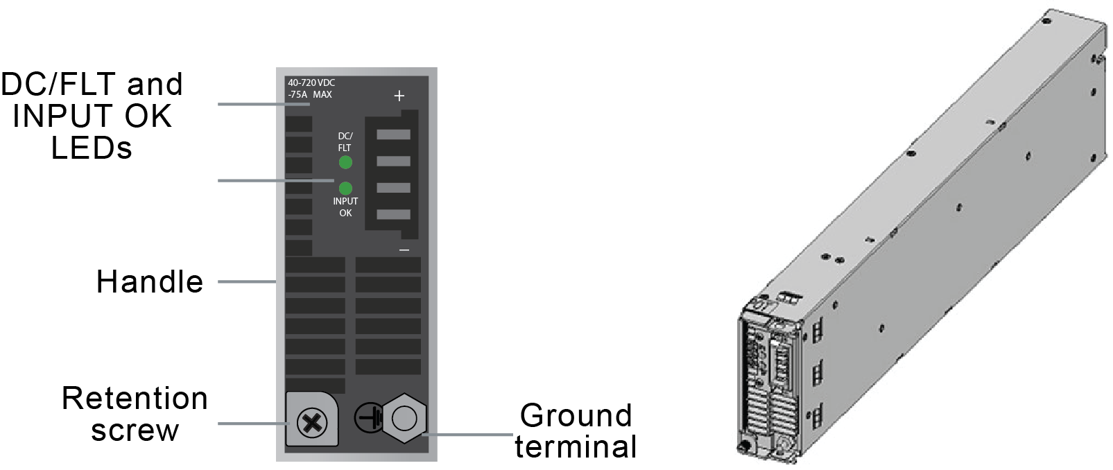 The FortiSwitch-AX9004G chassis front panel can include up to eight hot swappable -48Vdc to -60VDC PSUs. The capacity of each PSU is 2500W..