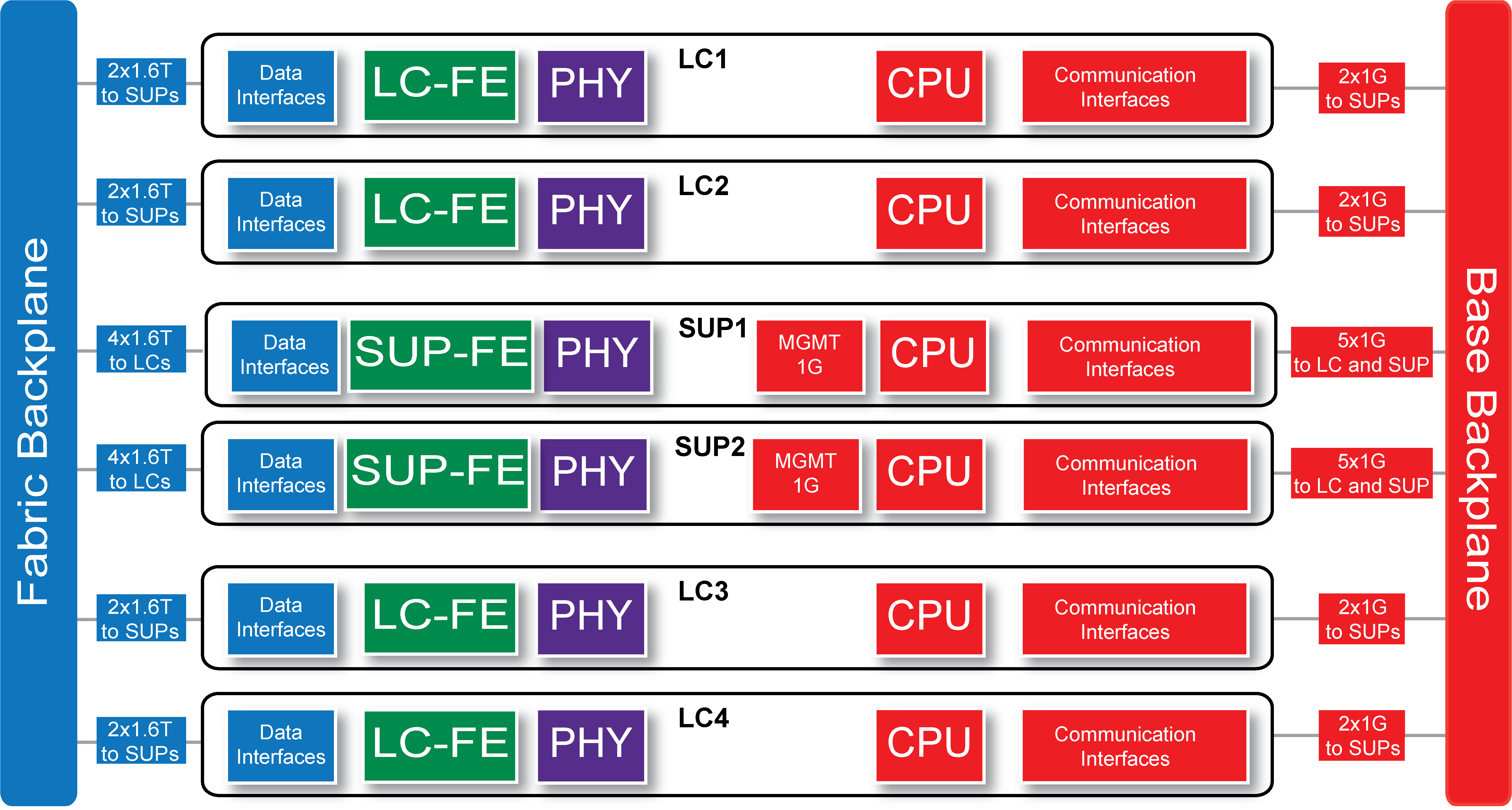 By default, SUP1 is active and SUP2 is standby. Active refers to the SUP that is controlling the chassis. The MGMT interfaces and console ports on both SUPs are always available. Each SUP have a SUP-FE (forwarding engine) and an LC has an LC-FE (forwarding engine). These FEs support data communication between the SUP and the LCs. The FortiSwitch-AX9004G also supports communication among all SUPs and LCs. The base backplane includes 1Gbps ethernet management connections between the SUPs and the LCs.
