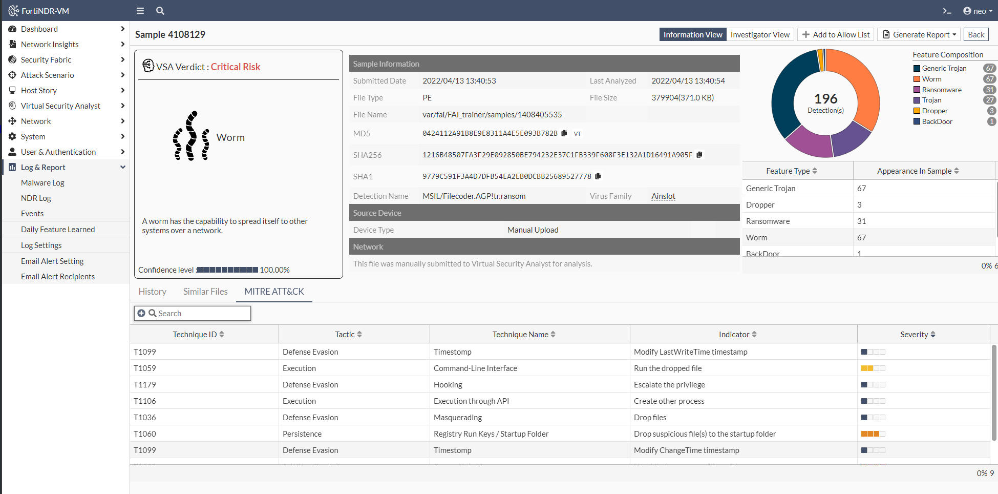 FortiNDR has a similar engine based analysis based on features detected. This is good for detecting similar variants of the original malware. |