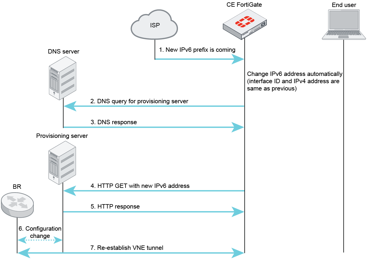 update-urlto update the new IPv6 address to the provisioning server. The provisioning server updates the FortiGate’s IPv6 address to the BR so the VNE tunnel can be re-established.Communication sequence overview of re-establishing VNE tunnel: