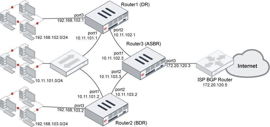 In this example, three FortiGate devices are configured in an OSPF network.