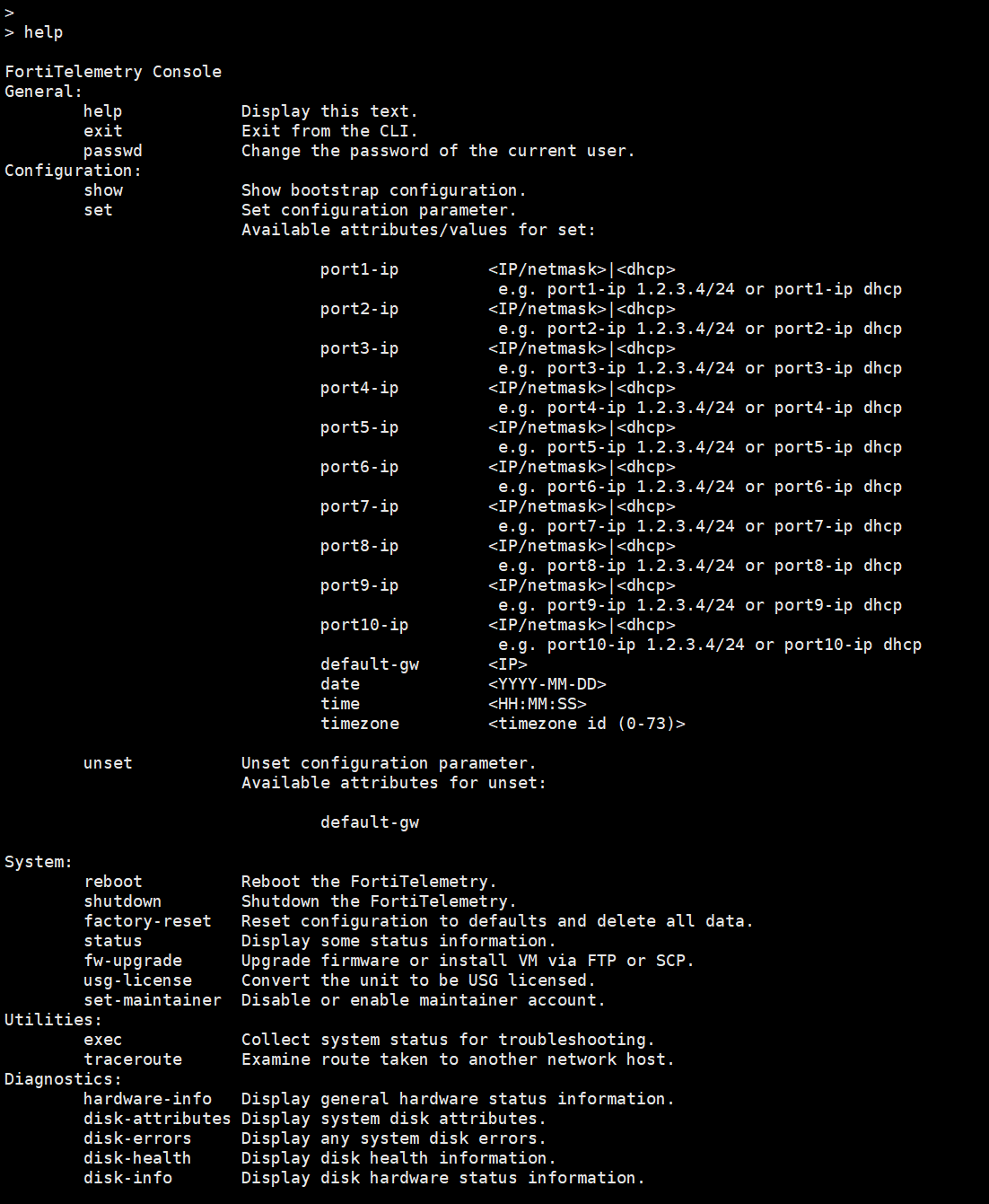 You can use the help command in the FortiTelemetry console to view available commands.