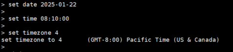 The following CLI commands can be used to configure the system time and timezone: