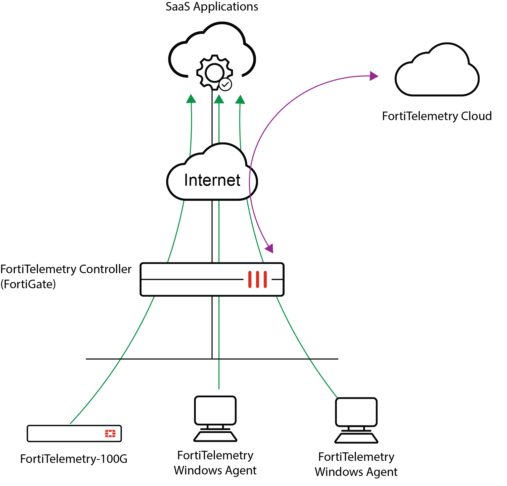 A FortiTelemetry deployment consists of one FortiGate acting as FortiTelemetry Controller and one or more FortiTelemetry agents.