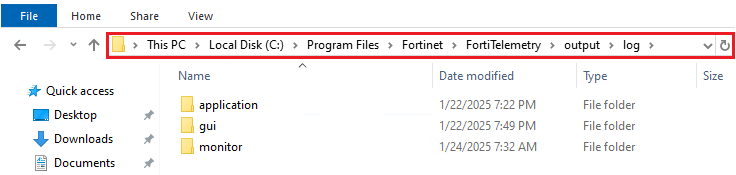 Logs related to the operation of the FortiTelemetry agent and the monitoring tasks can be located in the output\log directory inside the install directory.