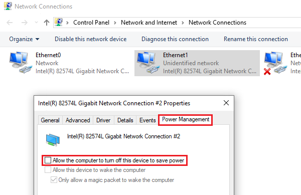 Click on the Power Management tab, and uncheck the Allow the computer to turn off this device to save power setting.