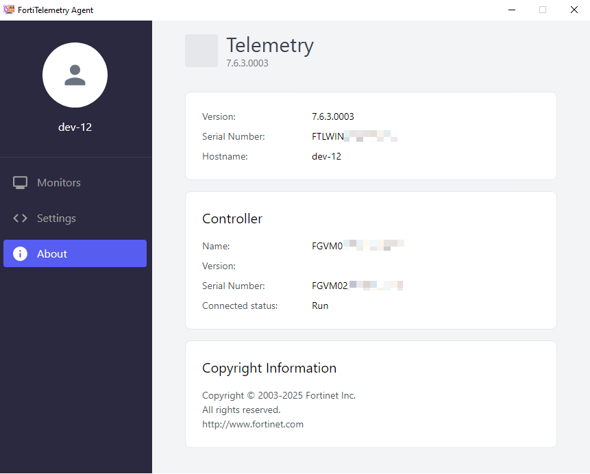 The GUI includes 3 tabs which display different information about the FortiTelemetry Windows agent and allows you to make selections for configuration. These tabs include Monitors, Settings, and About.