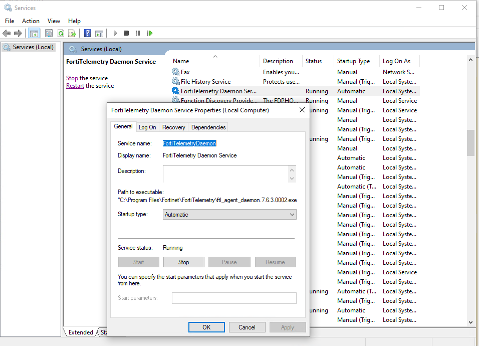 The FortiTelemetry agent daemon will automatically run after installation or on restarting the Windows system. You can use the Services app on the Windows system to Start, Stop, Pause and Resume the FortiTelemetry Daemon service as shown in the example below.