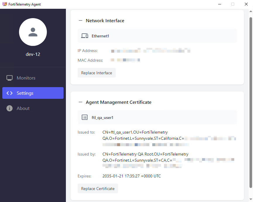 This tab can be used to later replace the interface or certificate used by the FortiTelemetry Windows agent.
