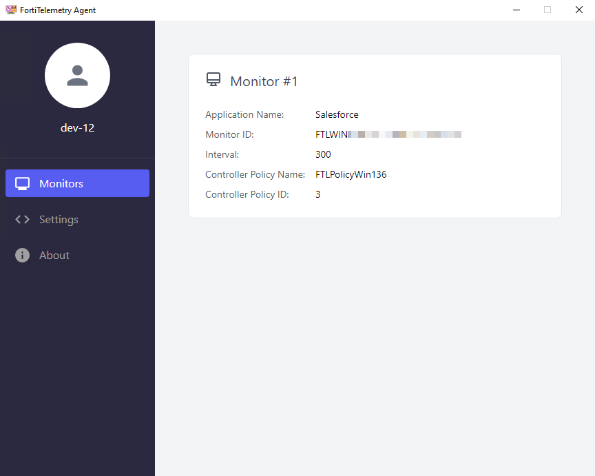 When the connection between the FortiTelemetry Windows agent and the FortiTelemetry Controller is successful, and the correct configuration for application monitoring is present on the FortiGate, the FortiGate will send monitoring tasks to the agent. The details of the current monitoring tasks on the agent can be seen from the Monitor tab.