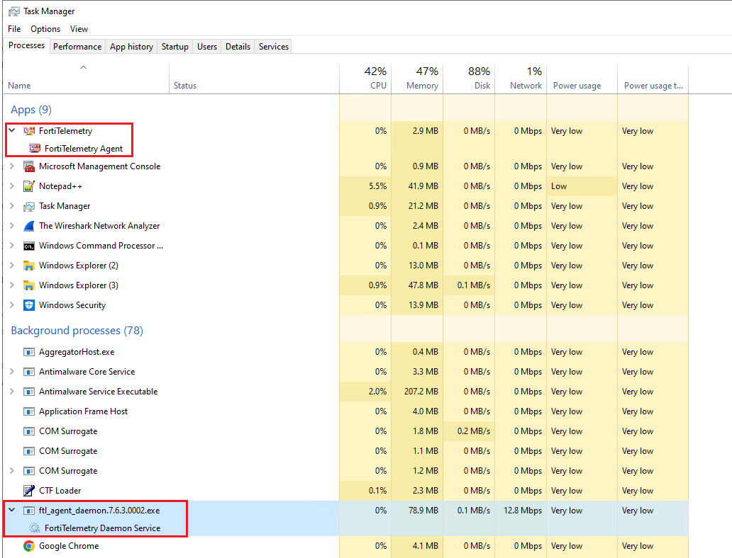 You can use the Windows Task Manager to check the status of the FortiTelemetry agent processes, as in the example below.