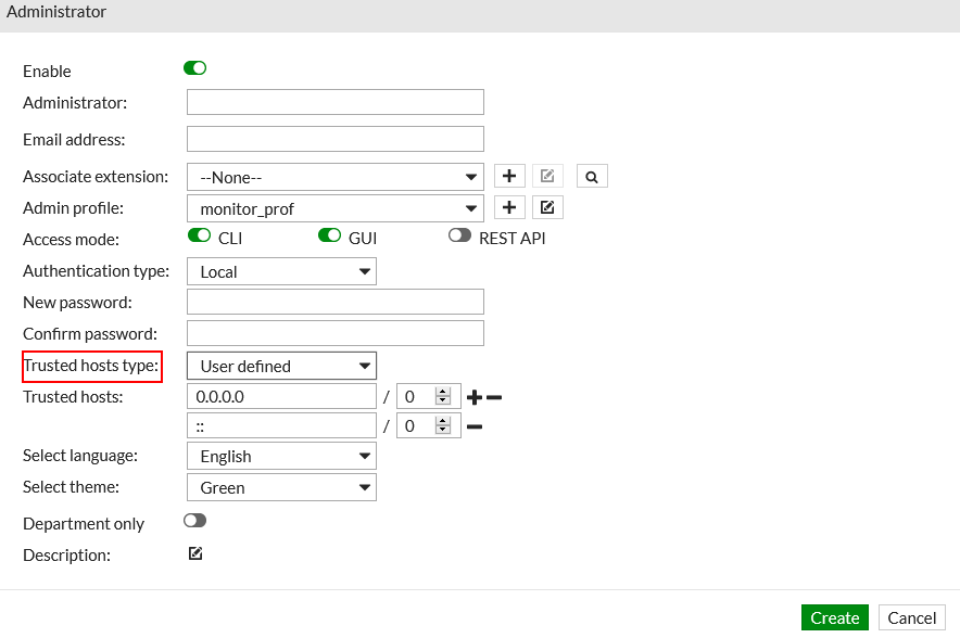 Certain IP subnets can be designated as allowed or trusted for administrators to log into FortiVoice. This configuration can allow local networks to access the system but restrict remote access to the system and restrict remote access to the system.