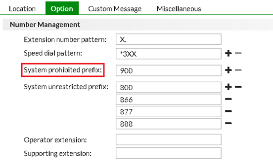 - Under Number Management, add all undesirable prefixes to the System prohibited prefix section.