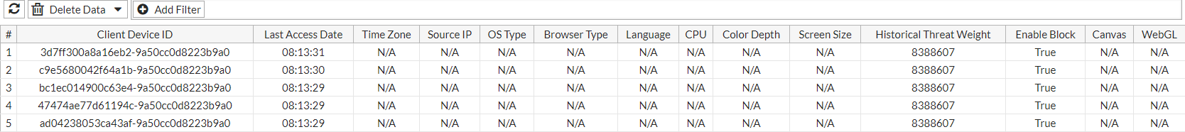 To begin tracking a client device that triggered a security violation, FortiWeb generates a unique Client Device ID according to a set of its characteristics, including the time zone, source IP, operating system, browser, language, CPU, color depth, and screen size. When a Client Device ID is assigned to a device, FortiWeb also begins tracking that device's last access date and historical threat weight. It is possible to monitor each device that FortiWeb tracks in the web UI.