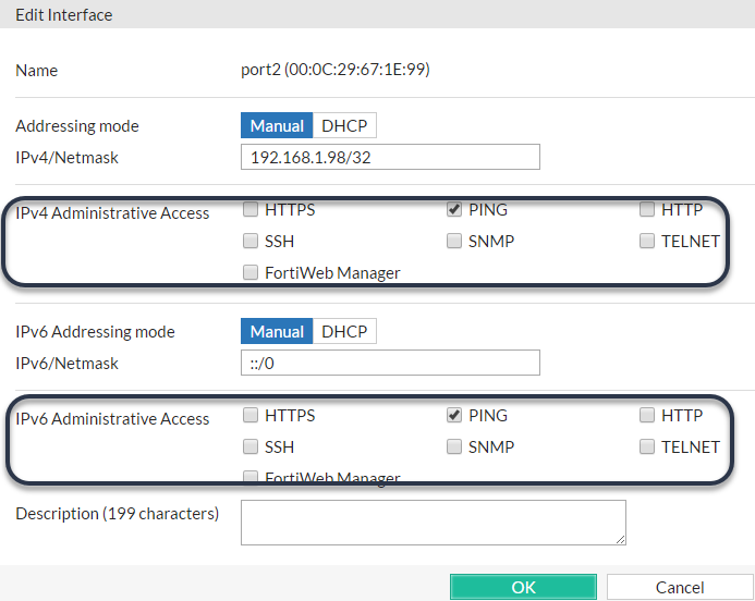 Restrict administrative access to a single network interface (usually port1) and allow only the management access protocols needed in System > Network > Interface