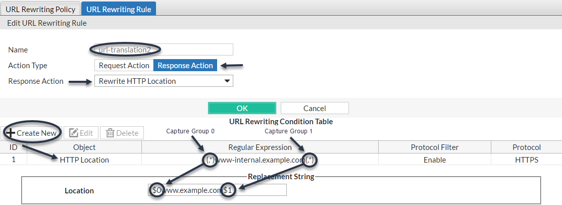 To assemble the rewritten URL by re-using the original request’s file path and Host:, the administrator uses two back reference variables: $0 and $1. Each variable refers to a part of the original request. The parts are determined by which capture group was matched in the Regular Expression field of each condition table object.