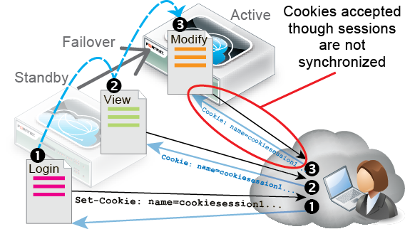The table of FortiWeb client session histories is not synchronized between HA members. If a failover occurs, the new active appliance will recognize that old session cookies are from a FortiWeb, and will allow existing FortiWeb sessions to continue. Clients’ existing sessions will not be interrupted.