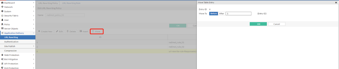 You can move a rewrite rule to adjust the order of entries via CLI or GUI as below: