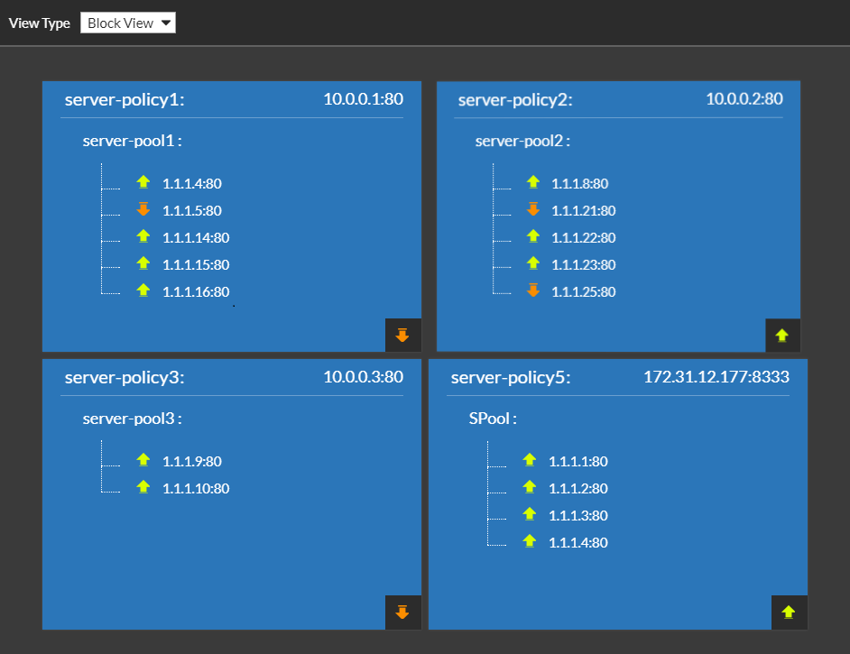From this window, you can see each server policy and its server or server pool configuration. The default View Type is Block View: