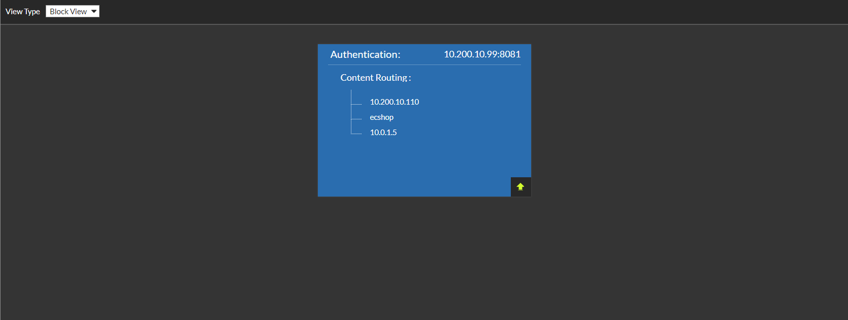 From this window, you can see each content routing policy and its corresponding server policy. The default View Type is Block View: