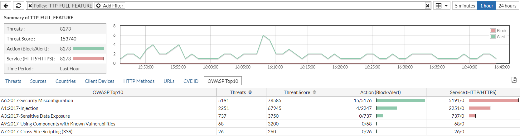 Also, you can view information about specific types of threats, the source IP of attacks, the country where the attacks come from, the client devices that launched attacks, HTTP methods used, targeted URLs, and CVE IDs for the specified server policy under the tabs Threats, Sources, Countries, Client Devices, HTTP Methods, URLs, CVE ID, and OWASP Top10 tabs respectively. You can use either the Add Filter icon to filter for these things, or select the relevant tab and double-click the row of the thing you want to know more about.