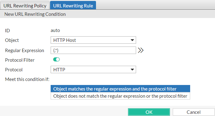 Enable if you want to match this condition only for either HTTP or HTTPS. Also configure Protocol. For example, you could redirect clients that accidentally request the login page by HTTP to a more secure HTTPS channel—but the redirect is not necessary for HTTPS requests. As another example, if URLs in HTTPS requests should be exempt from rewriting, you could configure the rewriting rule to apply only to HTTP requests. |