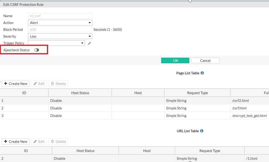 To enable this function, turn on the Ajaxcheck Status in Web Protection > Advanced Protection > CSRF Protection.