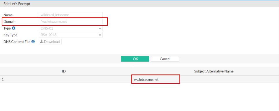 • Make sure the domain names do not overlap, for example, "*.wc_letsacme.net" can't be added together with "a.wc_letsacme.net".
