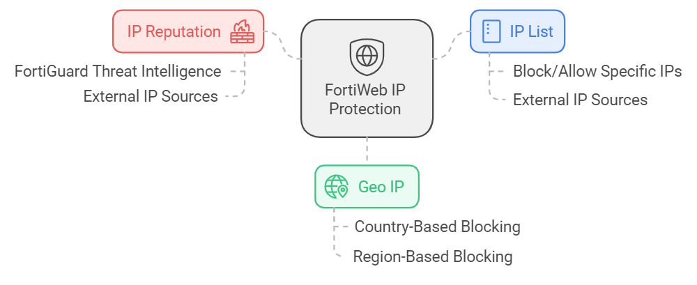 FortiWeb’s IP Protection features include IP List, Geo IP, and IP reputation.