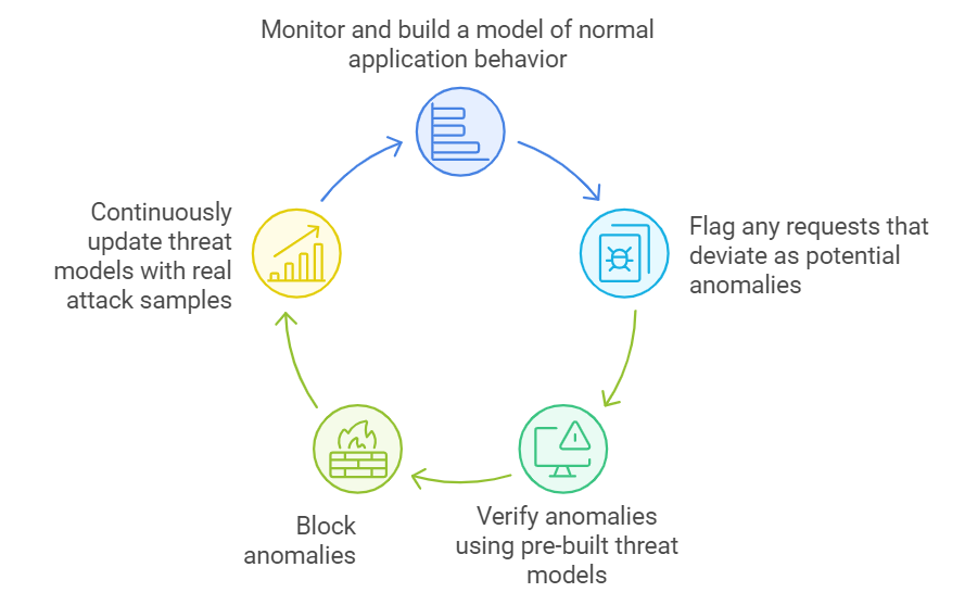 The second layer then verifies these anomalies using pre-built, continuously updated threat models trained on thousands of real attack samples, such as SQL Injection and Cross-site Scripting (XSS).