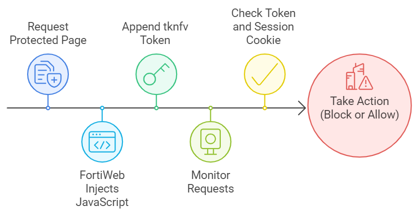 When a protected page is requested, FortiWeb injects JavaScript to append the tknfv token to HTML links, forms, and AJAX requests. The token is tied to the session cookie managed by Client Management. FortiWeb monitors requests to the URLs in the list, and if a request lacks the token or the token doesn’t match the session cookie, it takes the specified action, such as blocking the request. Proper configuration ensures effective protection without false positives.