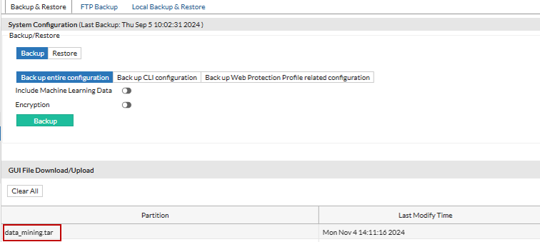 - Download the "data_mining.tar" file in System > Maintenance > Backup & Restore. Send it to Fortinet Support team for troubleshooting.