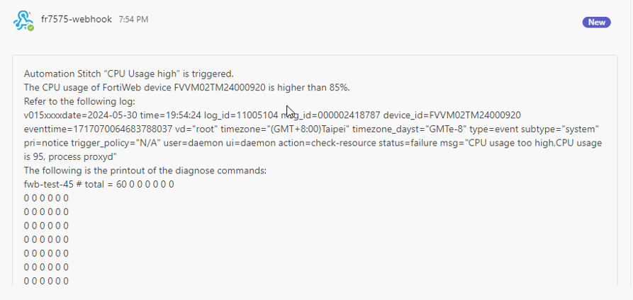 - Notification: FortiWeb sends an alert to the designated Microsoft Teams channels, notifying the IT team of the high CPU usage and the debug information.